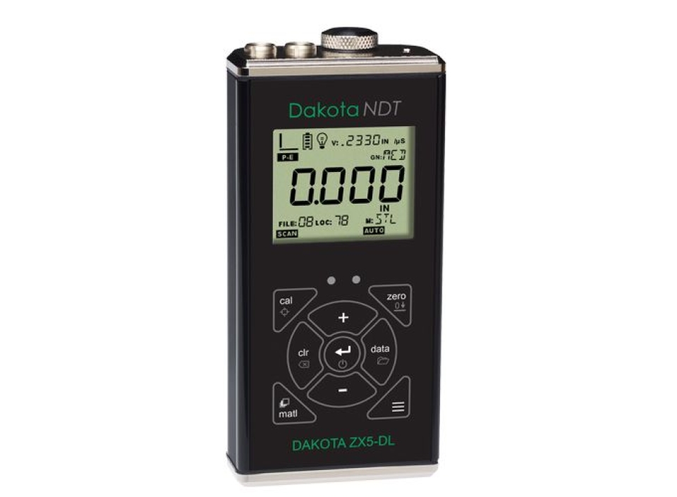 O Dakota ZX-5DL é um medidor de espessura por ultrassom voltado para inspeções de alta precisão e memória interna para armazenamento de dados. Com capacidade de operação nos modos pulso-eco (PE) possui resolução de 0,01 mm, faixa de medição de 0,63 a 914,4 mm, além de correção automática do caminho duplo (V-path) e calibração de velocidade ajustável de 305 a 18.542 m/s. O modelo ainda conta com armazenamento de até 10.000 leituras, organizadas em 40 arquivos e utilização de Software.