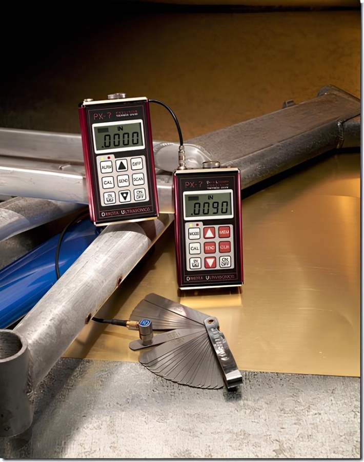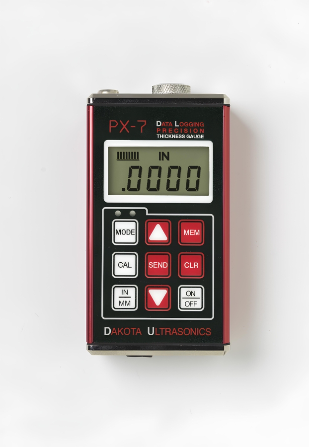 Medidor de Espessura Industrial por Ultrassom da Dakota Ultrassonics Temos dois modêlos PX - 7 / PX - 7 DL - Alta preçisão , faixa de medição , 0,15 mm até 25,4 mm , resolução 0,001 mm / 0,0001 in , utiliza duas pilhas alcalinas 2 AA , acompanha o aparelho , cabeçote delay line mono cristal , dia. 1/ 4 " de 15 MHZ com cabo + capa de proteção + gel + manual + certificado do fabricante rastreado pelo NIST / EUA + mala de transporte . PX - 7 DL - com data logger + cabo de transferência de dados e software . MEDE ESPESSURA DE GARRA PET